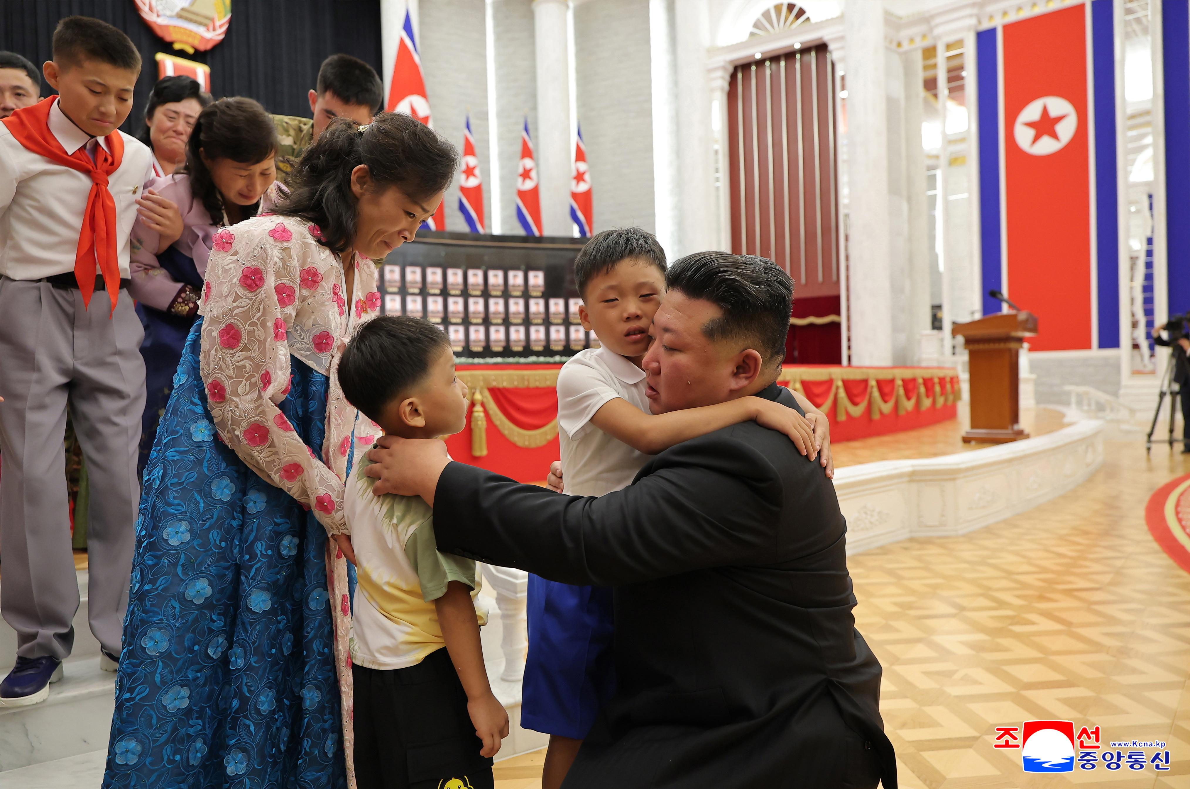 Снимки, публикувани от информационната агенция, показват как севернокорейският лидер прегръща видимо развълнувани членове на семействата на загинали войници.
