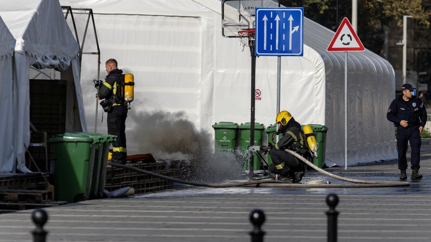 Бяха произведени няколко изстрела, след което в палатката, една от няколкото, издигнати тази година от поддръжници на президента Александър Вучич по време на антиправителствени протести, избухна пожар.
