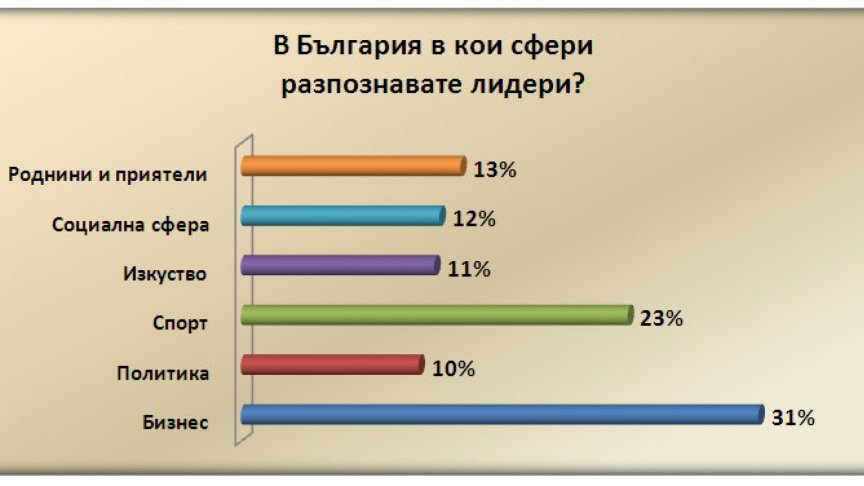 Проучване на национална телевизия Bulgaria ON AIR и бизнес каналът Bloomberg TV Bulgaria показа в кои сфери българите разпознават лидери у нас. Над 30% смятат, че са бизнесмени, а едва 10% - политици.