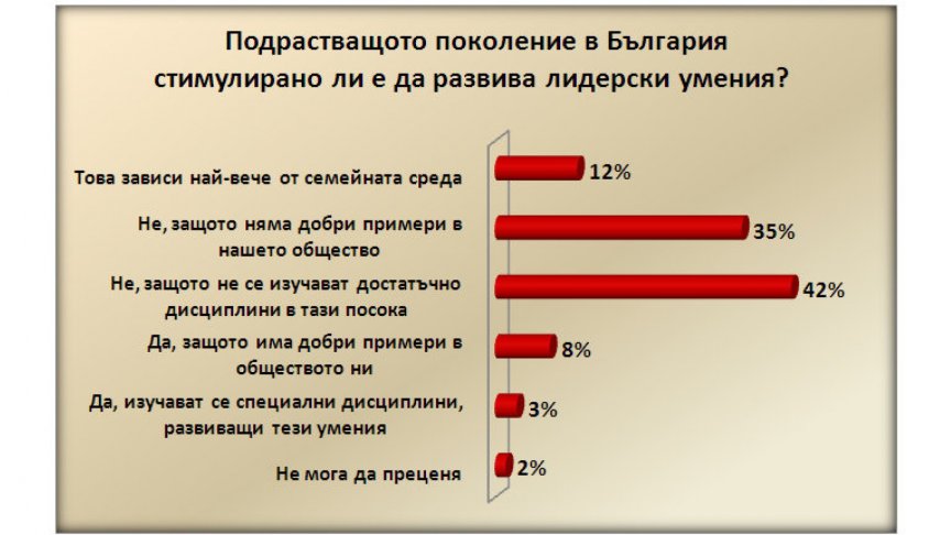 Повечето участници в проучването смятат, че само някои се раждат с лидерски умения, но трябва да ги развиват и в бъдеще (63%), а други вярват, че всеки може да бъде лидер (31%). Проблемът според 42% от анкетираните е, че в България не се стимулира изучаването на достатъчно дисциплини в тази посока.