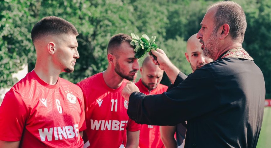Водосвет за здраве бе извършен преди тренировката на ЦСКА тази вечер на базата в Панчарево. "Армейците" публикуваха снимки в социалните мрежи, придружени с фразата "С нами Бог", която намери място върху фланелките на клуба и фен артикули.